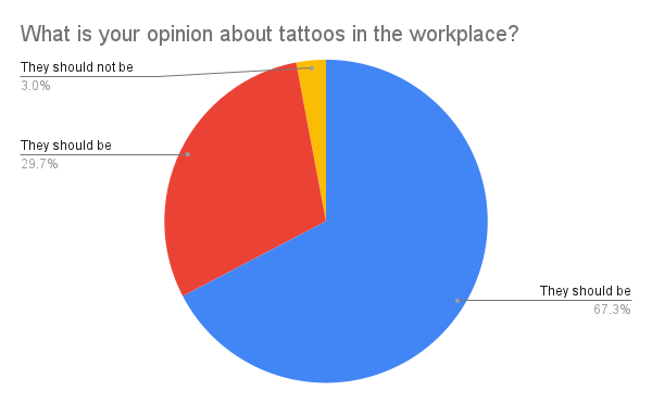 The survey contained a few different polls asking individuals, “What is your opinion about tattoos in the workplace?” Of the 101 participants from the survey, about 67% said they should be allowed freely/openly, 29% said they should be regulated, and 3% said they should not be allowed at all. The majority of voters in this poll voted that tattoos should be allowed freely/openly.