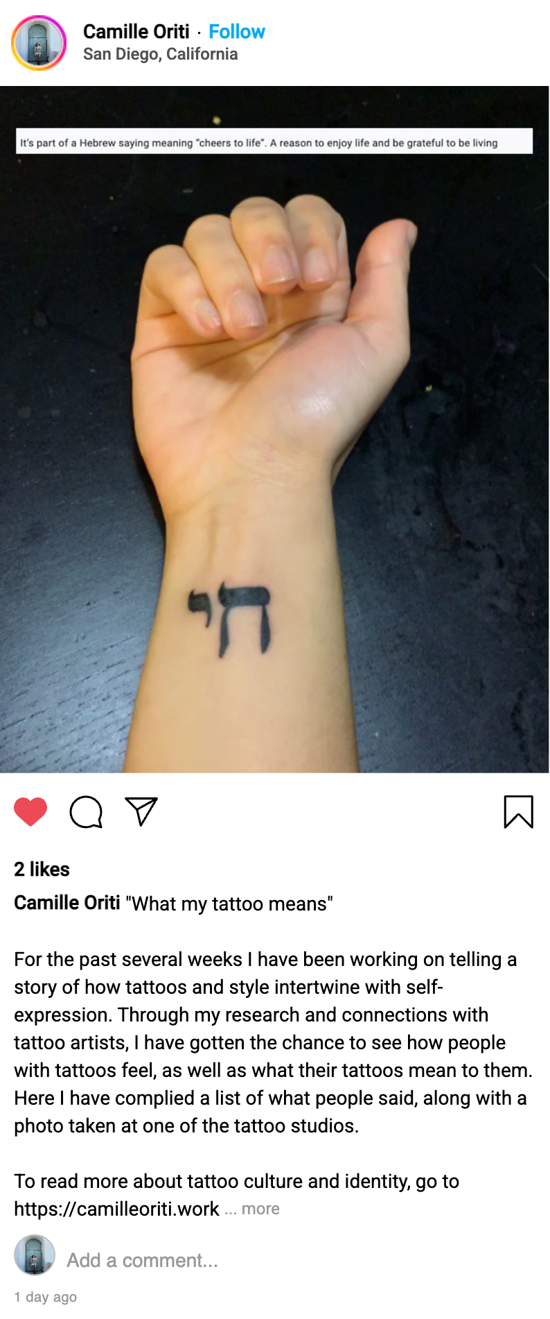 This was a picture I took at one of the tattoo studios I had the chance to go to. She told me about the tattoo and what it meant: "It's part of a Hebrew saying meaning "cheers to life". A reason to enjoy life and be grateful to be living.